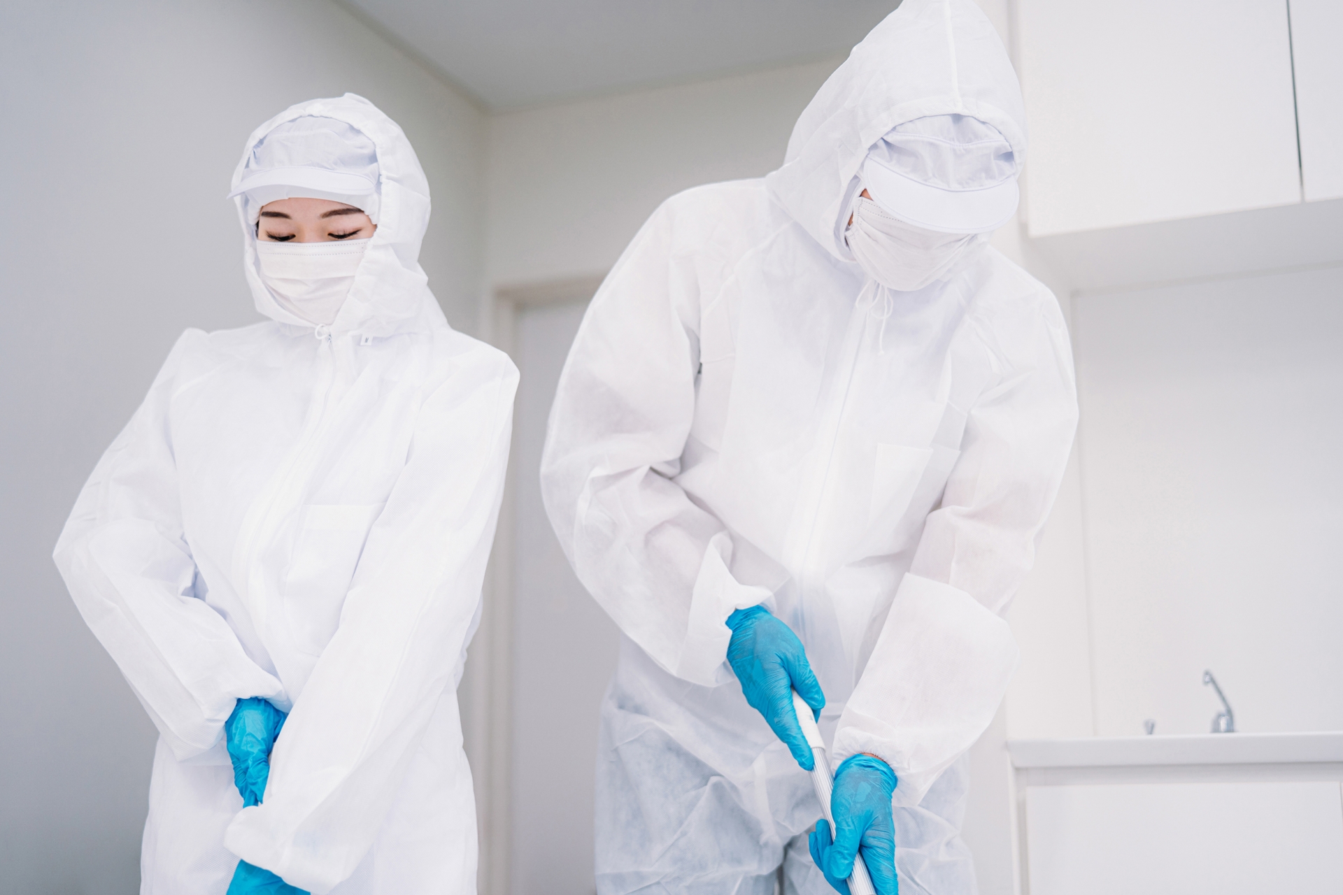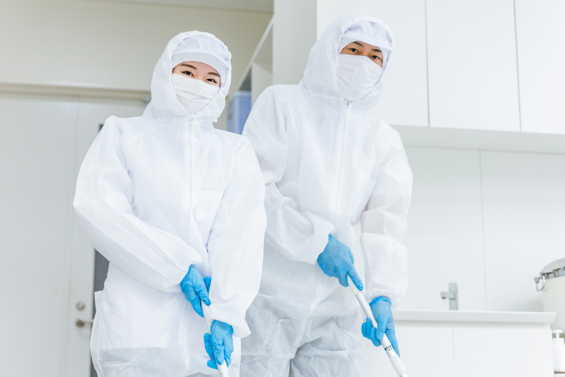 初期消毒から除菌・脱臭・原状回復まで、一貫した工程で徹底的に清掃します。